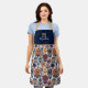 Der untere Teil dieser einzigartigen Schürze weist ein Muster bohischer Blume in Blau-, Zimtbraun- und Goldtönen auf. Das Muster wird auf einem weißen Hintergrund platziert. Der obere Teil ist massiv passend dunkelblau, mit Ihrem Monogramm in Gold und Ihrem Namen in hellblau.