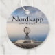 Foto der Globe an der Nordkap in Nordnorwegen, mit wunderschönen Wolken und Licht im Hintergrund. Koordinaten, die über das Design geschrieben sind.