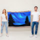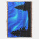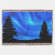 Diese digitale Grafik kennzeichnet eine Anzeige der Wirblen blauen Lichter im Nachthimmel über den Silhouetten von zwei Evergreens.