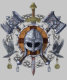 Cette oeuvre d'art de l'Armurerie Norse Viking Warrior présente un ancien marteau de guerrier scandinave viking, une épée, un bouclier, des runes nordiques et un corbeau de mythologie nordique.
