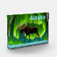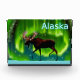 Ein immer leicht stilisiertes Bild eines Elchs, der gegen die Nordlichter silbrig geschmückt ist. Der Text "Alaska" erscheint in leuchtendem Blau und Weiß.
