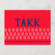 Rot blaue und weiße Postkarte mit vielen Dankeschön auf Norwegisch. In Norwegen sagen sie Takk. Weiße Wikingerschilde auf rotem Hintergrund in den Farben der norwegischen Flagge.