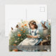 Ein junges Mädchen in einem blauen Kleid mit weißen Kruffeln sitzt auf einer Holzbank inmitten eines blühenden Gartens. Sie liest eine kleine Karte, während Schmetterlinge um sie fliegen. Ein Hasen und ein kleines Kaninchen sitzen neben ihr, während andere Frühlingsblumen in warmen Farben im Hintergrund blühen. Die Worte "Happy Oaster" geben dem Bild eine festliche Touch.