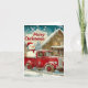 Diese zauberhafte Winterlandschaft besticht durch einen Vintagen roten LKW, der einen fröhlichen Schneemann im Rücken trägt. Der LKW, der an der Tür mit einer Schneeflocke geschmückt ist, ist mit einer Schneedecke bedeckt. Im Hintergrund gibt es ein Holzhaus mit schneebedecktem Dach und an den Ofen hängenden Fahrrädern, die das festliche Ambiente noch verstärken. Schneeflocken fallen sanft aus einem Himmel, der mit blauen und weißen Wolken gefüllt ist, während der Text "Frohe Weihnachten" in roten Buchstaben sichtbar wird, was das Wesen einer traditionellen und nostalgischen Feier abbildet.