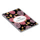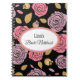 Notebook mit einer Grafik von hübsch rosa Rosen auf schwarzem Hintergrund mit der Phrase "Bride Notebook" in einer ovalen Form mit koordinierenden Rahmen. Passen Sie dieses Element an und ändern Sie den Namen in Ihren Namen oder entfernen Sie den Namen. Börsenbild freepik.com