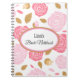 Notizbuch mit einer Grafik von hübsch rosa Rosen auf weißem Hintergrund mit der Phrase "Bride Notebook" in einer ovalen Form mit koordinierenden Rahmen. Passen Sie dieses Element an und ändern Sie den Namen in Ihren Namen oder entfernen Sie den Namen. Börsenbild freepik.com