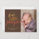 Ce faire-part de naissance bébé à thème Halloween/automne comporte les mots "notre petit citrouille" dans la typographie de script moderne en couleurs d'automne sur un arrière - plan marron. Les détails de naissance de votre bébé sont affichés en dessous et sa photo se trouve à droite. Photographie © Storytree Studios, Stanford, CA