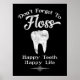 Une image amusante sur le thème du tableau de bord dentaire avec une grande dent blanche et le message "N'oubliez pas de soie dentaire, dents heureuses, vie heureuse" en noir et blanc.