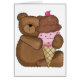 Un ours de nounours adorable s'asseyant et s'accrochant à son cornet de crème glacée géant avec un scoop de crème glacée de chocolat et un scoop de la fraise.