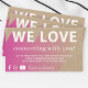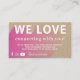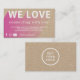 Customisez cette carte de marketing d'entreprise branchée. Il est parfait pour une entreprise de commerce électronique comme une boutique, un magasin Etsy ou toute autre petite entreprise. Il comporte l'expression "NOUS AIMONS" et dispose d'un texte personnalisable pour expliquer plus de détails. L'envers peut être utilisé pour afficher le logo personnalisé de votre entreprise. Ce produit express l'intérêt de se connecter avec les clients en encourageant les acheteurs à vous envoyer des messages et à suivre votre entreprise sur les médias sociaux avec l'information fournie à côté des icônes de médias sociaux Facebook, Instagram et YouTube.