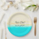 Bord de mer, eau sarcelle, plage de sable, assiettes en papier parfaites pour un mariage ou une baby shower sur le thème de la plage. Le texte dit "Nous avons fait" et vous pouvez modifier la date.