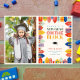 "New Grad On The Block", thème de remise des diplômes pour enfants de l'école primaire / maternelle / maternelle avec illustration des maisons de quartier colorées et des bâtiments à droite autour du texte avec votre photo personnalisée à gauche.