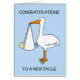 Une cigogne géante tient un petit garçon dans un drap accroché au bec de la cigogne. L'image a un arrière - plan bleu pastel.