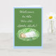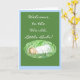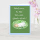 Une carte de bienvenue pour un nouveau bébé, avec un bébé endormi et des lettres blanches sur un arrière - plan vert foncé, bordé de bleu.