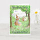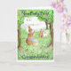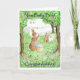 Une carte de félicitations de "nouveau bébé" avec un lapin traînant la blanchisserie sur la ligne et un groupe de plus petits lapins admirant le nouveau venu dans son landau. D'une couleur pour aquarelle peinte à la main par Judy Adamson. Masquez l'intérieur pour votre propre message.