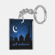 Illustration de l'Aïd avec silhouettes de la lune, étoiles et mosquée sur un ciel bleu nuit.
