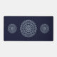 Un mandala en forme de dentelle en cercle concentrique en bleu clair avec des points bleu vif et dorés comme des étoiles, frangés entre les couches, crée un design amusant qui rappelle un ciel étoilé étoilé.
