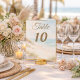 A soft watercolored beach, coastal scenery. Personalize and your table numbers one by one.
