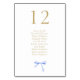 Cette jolie carte blanche de table dispose d'un joli ruban bleu aquarelle et d'une police en faux or. Le design comprend 10 personnes par table, mais le design peut accueillir jusqu'à 12 personnes maximum. La conception est répétée à l'arrière pour une visibilité facile de tous les côtés de la table. Ajoutez chaque panneau avec un numéro de siège individuel au panier.