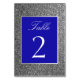 Écriture calligraphique simple et moderne, numéro de table pailleté élégant argent et bleu royal.