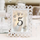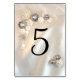 Customisez ces jolis Faux White Pearl and Diamond Buttons Numéros de tableau pour ajouter une touche de classe à votre fête de fiançailles, déjeuner de douche nuptiale ou dîner de réception de mariage. Ces élégantes cartes de numéro de table personnalisées disposent d'une photo de perle blanche vintage et de boutons en diamant avec un arrière - plan satiné blanc.
