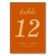 Numéro de table mariage simple pour une couleur mariage orange brûlée. C'est juste du texte jaune doré sur un arrière - plan orange brûlé. Tout sauf le numéro lui-même est écrit dans un élégant script calligraphique.