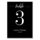 Un blanc sur la calligraphie noire pour le mot, "table", avec le nombre dans une grande police romaine qui peut être customisé avec n'importe quel numéro de table. Les graphiques apparaissent des deux côtés de cette carte.