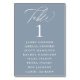 Elégante calligraphie blanche "table", avec les noms d'invités et le numéro de table, le mariage numéro de table carte de sièges. La couleur Arrière - plan affichée en bleu poussiéreux peut être customisée.