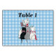 Cette carte de numéro de table pour vos fêtes et événements est un motif plaid bleu et blanc clair avec une mère chatte blanche souriante assise avec ses trois chatons qui sont noirs, blancs et gris portant des arcs roses autour du cou. customiser le numéro de table avec le modèle.