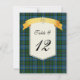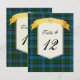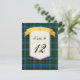 Belle carte de numéro de table de mariage à carreaux écossais réalisée avec le motif tartan coloré bleu, vert, rouge et jaune du clan MacLeod. Une zone de texte de couleur crème décorative, au milieu, comporte des graphiques d'un ruban de style bannière jaune doré, en haut. Des graphiques d'un Luckenbooth de couleur or, symbole de l'amour écossais, ornent le milieu du ruban. Le texte en noir est entièrement personnalisable pour répondre aux besoins de votre réception. Produits de mariage assortis disponibles. Personnalisez-en un pour chaque table à votre réception de mariage.