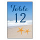 Une belle photo d'une plage avec une paire d'étoiles de mer sur le sable est au centre de cette carte de numéro de table de mariage de plage d'été. Choisissez-le pour votre table de mariage décontractée sur la plage.