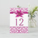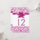 Élégante carte de numéro de table de réception de mariage réalisée dans un motif damassé floral violet rose et blanc. Des graphismes d'un ruban de satin violet rose et une jolie fleur de lily stargazer ornent la partie supérieure de la zone de texte blanche. Personnalisez le numéro de couleur violette pour chaque table à votre réception.