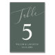 Numéro de table de mariage minimal et élégant avec texte de script moderne qui dit "Table" en haut sur un arrière - plan vert forêt.