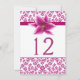 Élégante carte de numéro de table de réception de mariage réalisée dans un motif damassé floral violet rose et blanc. Des graphismes d'un ruban de satin violet rose et une belle fleur de lily stargazer ornent la partie supérieure de la zone de texte blanc. Personnalisez le numéro de couleur violette pour chaque table à votre réception.