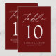 Cartes de numéro de table mariage tendance et minimaliste avec lettrage moderne blanc avec "Table" dans script de calligraphie moderne. Le design est composé d'un arrière - plan bordeaux ou d'une couleur de votre choix. Le dessin se répète à l'arrière. Pour commander les cartes de table bordeaux : ajoutez votre nom, votre date de mariage et votre numéro de table. Ajoutez chaque numéro à votre panier individuellement et retirez-le lorsque vous avez terminé.