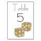 Cette carte de numéro de table sur mesure séduisante présente un design de casino en or et blanc. Une image de gros dés en parties scintillant dorée est imprimée au centre sur un arrière - plan blanc. Vous pouvez personnaliser la carte de table pour inclure votre propre nom ou texte personnalisé.