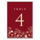 Élégant, chic rouge bordeaux numéro de table mariage avec dentelle dorée et calligraphie moderne.