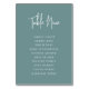 Des cartes numériques simples et chic en turquoise et blanc poussiéreux font une déclaration élégante à votre mariage ou événement. Le design comporte "table [nombre]" en écriture manuscrite, avec les noms d'invités individuels ci-dessous dans la typographie serif intemporelle. Le design se répète de part et d'autre.