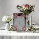 Carte numéro de table mariage avec arche grise foncée sur noir. Jolies fleurs roses et blanches, verdure et fleurs de trèfle pourpre. L'Arrière - plan est personnalisable à n'importe quelle couleur. Personnalisez le texte et la police à votre goût.
