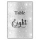 Le numéro de table est écrit avec un style de lettrage manuscrit élégant. Lettres noires, fond argenté faux avec fausse poussière de paillettes, scintille.