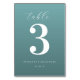 This elegant wedding table card features a minimalist design with a calming teal background and crisp white text. The focal point is the large, bold numeral "3" centered on the card, surrounded by an assortment of fonts that add visual interest without cluttering the layout. Customizable placeholders for names and dates allow personalization, making it perfect for formal events like weddings or upscale gatherings. The combination of cursive, serif, and sans-serif typography creates a sophisticated yet approachable feel, ideal for setting a refined atmosphere at your special occasion.