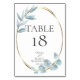 Carte de Numéro de Table de Mariage | Feuilles d'eucalyptus aquarelle dans des tons de bleu poussiéreux avec un cadre ovale doré. Personnalisez le texte, le style de police, la couleur et la taille. Œuvre originale créée pour le BarefootBride™ par © WhimsicalArtwork™ - Cela fait partie d'une suite complète de papeterie de mariage avec papeterie de mariage, de baby shower et d'autres événements correspondants.