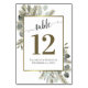 Faites de votre réception de mariage une belle avec ces cartes de numéro de table. Ils présentent un design magnifique avec une calligraphie en dentelle entourée d'une abondance de feuilles d'eucalyptus et de branches de pins dans les tons vert sauge et or. Il y a de l'espace pour les noms du couple et de la date du mariage ainsi que le numéro du tableau.
