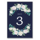 Ce numéro classique de table marine en fleurs blanches est parfait pour un mariage de automne. L'élégant design floral présente des roses blanches et en ivoire, des pivoines et du chrysanthème, avec des touches de fleurs d'aquarelle bleu percé et du feuillage vert sur un arrière - plan bleu foncé. La carte s'imprime à l'avant et à l'arrière (double face). Ajoutez chaque numéro de table dont vous avez besoin à votre panier individuellement.