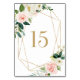 Aquarelle géométrique Fleurs printanières Numéro de tableau 15 | Numéro de table élégante et féminine avec des illustrations aquarelles de roses et pivoines blanches, roses de pêche et roses, accents de feuillage et cadre géométrique de fausse feuille. Ce numéro de table fleurie est parfait pour les évènements de printemps et de jardin.