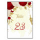 Fleurs romantiques rouge foncé & blanc avec carte de numéro de table de mariage botanique feuille or. Les détails de la parties scintillant sont simulés.