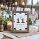 Ce Mexicain Floral Otomi Simple Fiesta Mariage Table Number design se compose d'une bordure simple et élégante, avec des éléments floral bleu foncé et des oiseaux délicatement placés dans chaque coin. La zone centrale est laissée en blanc, encadrée par une fine ligne bleue, qui fournit un cadre propre et minimaliste pour le texte. La combinaison d'oiseaux et de fleurs, ainsi que l'utilisation modérée des couleurs, donnent au design un look sophistiqué mais traditionnel, inspiré de motifs folkloriques mexicains.