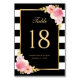 Elégante carte de numéro de table à fleurs rayées noir et blanc avec aquarelle rose et verdure dorée. Éléments correspondants disponibles.