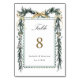 Watercolor evergreen pine garland table number with names and date. For more advanced customization of this design, please click the BLUE DESIGN TOOL BUTTON above!