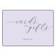 This wedding tabletop sign features a minimalist design with a soft lavender background, creating an elegant and serene atmosphere. The flowing script text reads "cards AND gifts" in a sophisticated cursive font, while the smaller sans-serif typeface below states "THANK YOU," conveying gratitude in a tasteful manner. The muted color palette and clean typography emphasize simplicity and clarity, making it perfect for expressing appreciation at your special event.